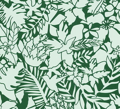 Papel pintado estampado en tonos verde y blanco. Gracias a su superficie son fáciles de limpiar y resistentes a la luz.